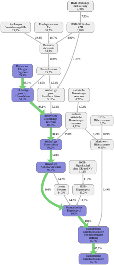 Figure 5: Delta Direkt Causal Graph. Delta’s financial factor network has a different profile than Dialog’s. Here, the green nodes for “economic capital” and equity are smaller but still positive, whereas the red nodes for reserves (HGB-Deckungsrückstellung, etc.) are prominent. The final ECR node shows a solid positive outcome, though reduced from prior years as some green arrows weakened and red arrows grew.